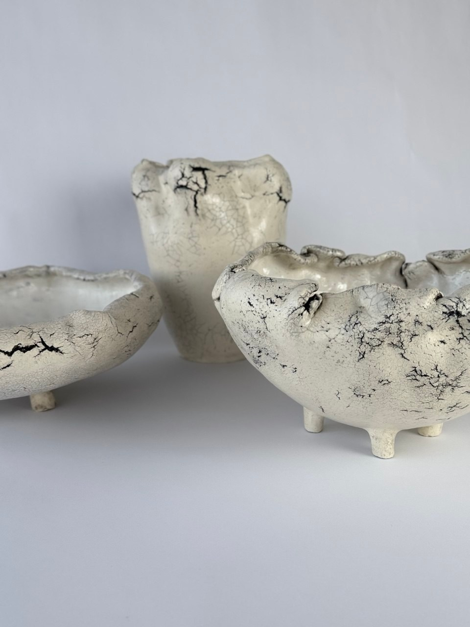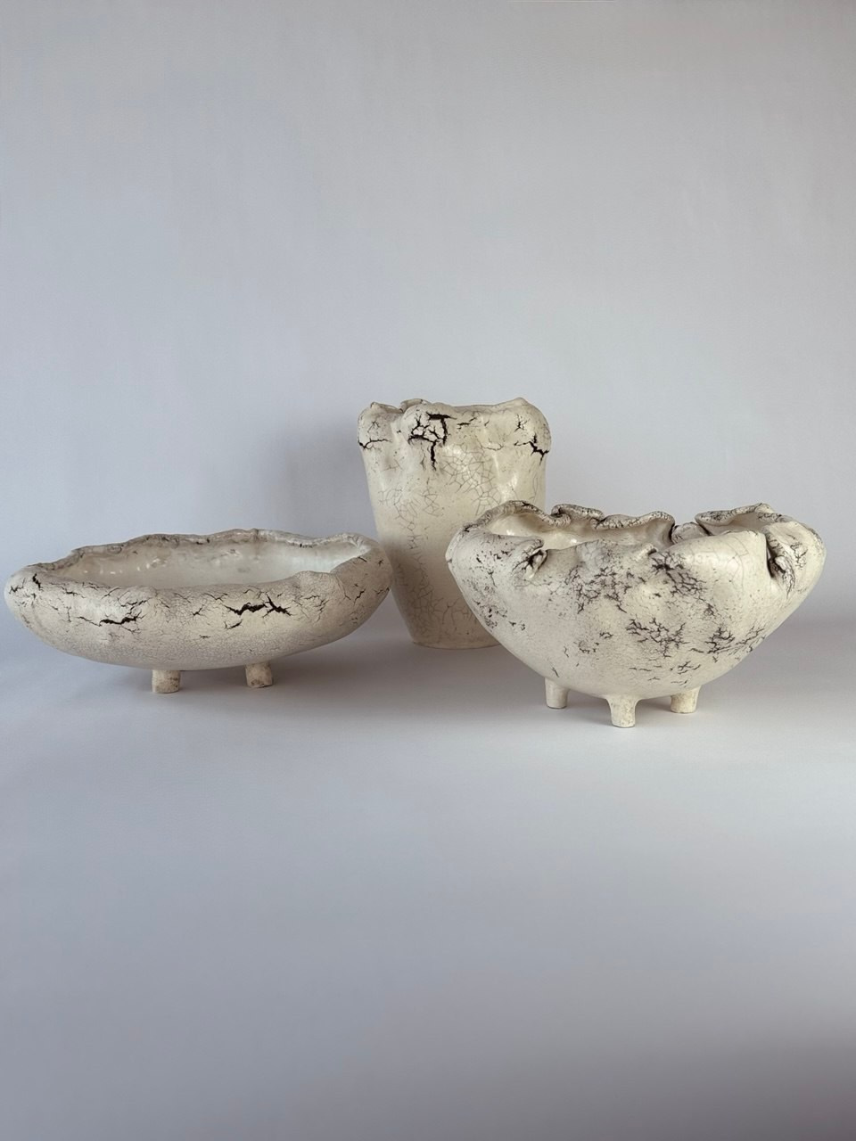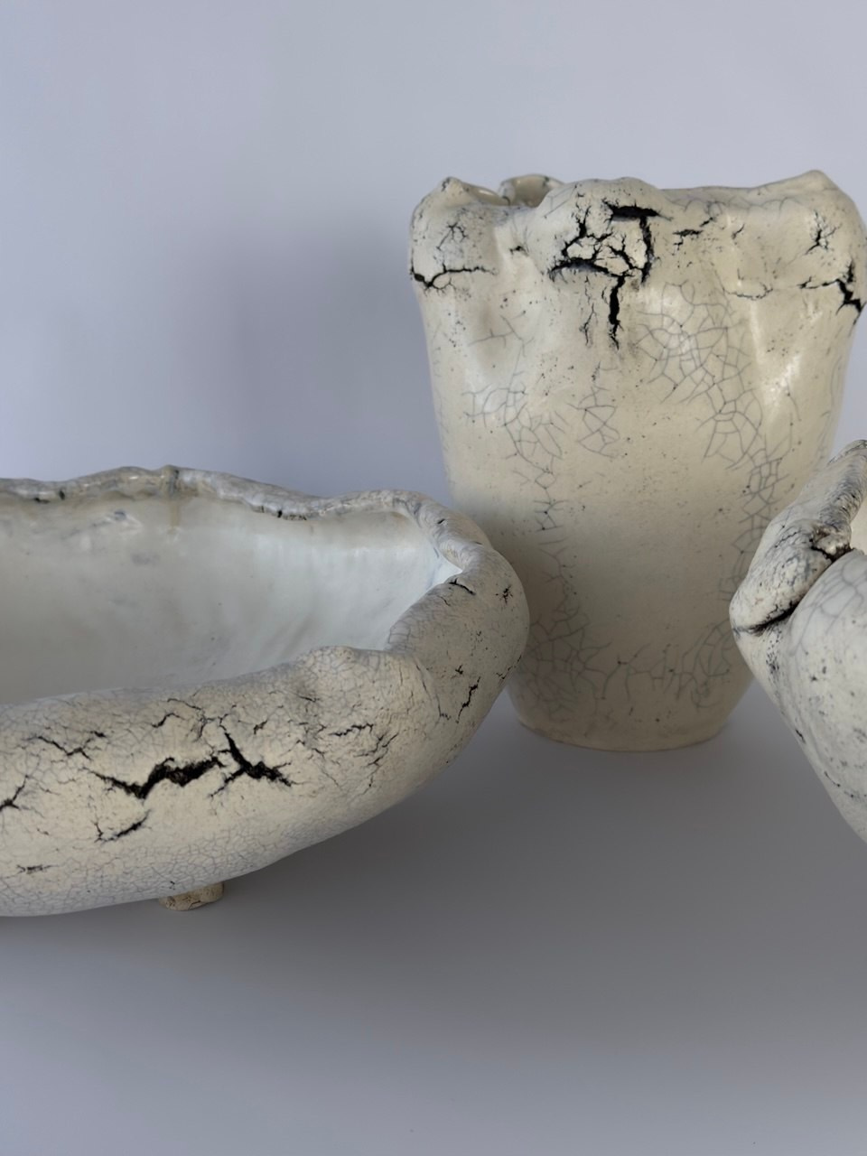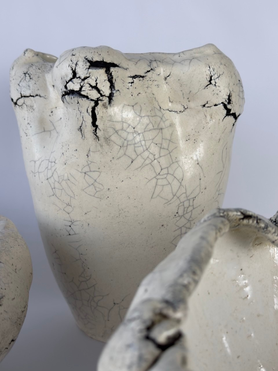 Серия «Еще, но не уже» исследует этот момент на уровне материи. Сосуды напоминают тающий весенний снег: внешне хрупкие, нестабильные, покрытые трещинами, они несут в себе следы холода. Трещины здесь — не дефекты, а свидетельство пройденного напряжения, визуальные проявления внутренней трансформации. Они трескаются, оплывают, теряют прежнюю жесткость, но именно в этом процессе обретают новую выразительность.