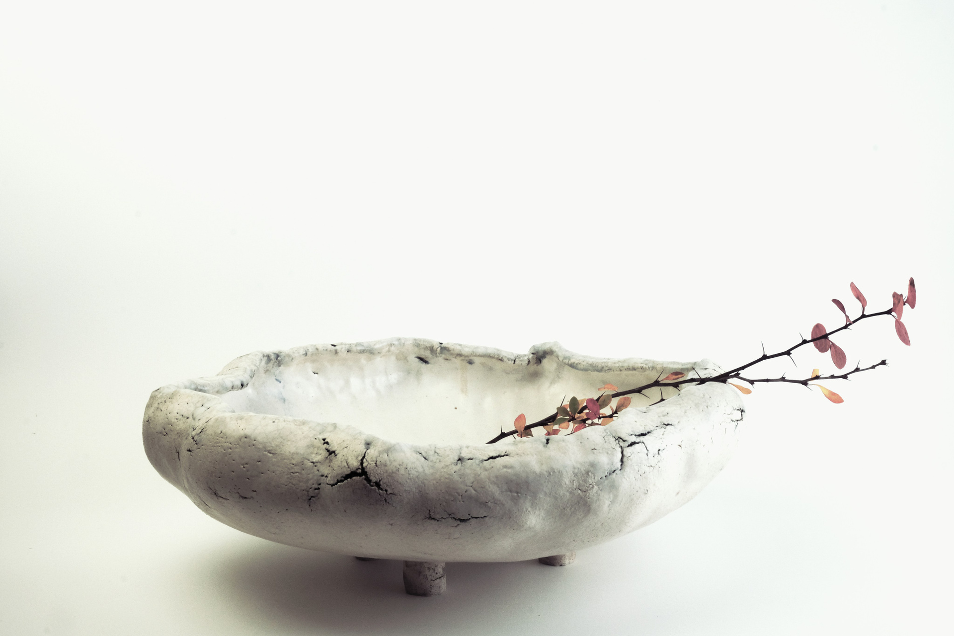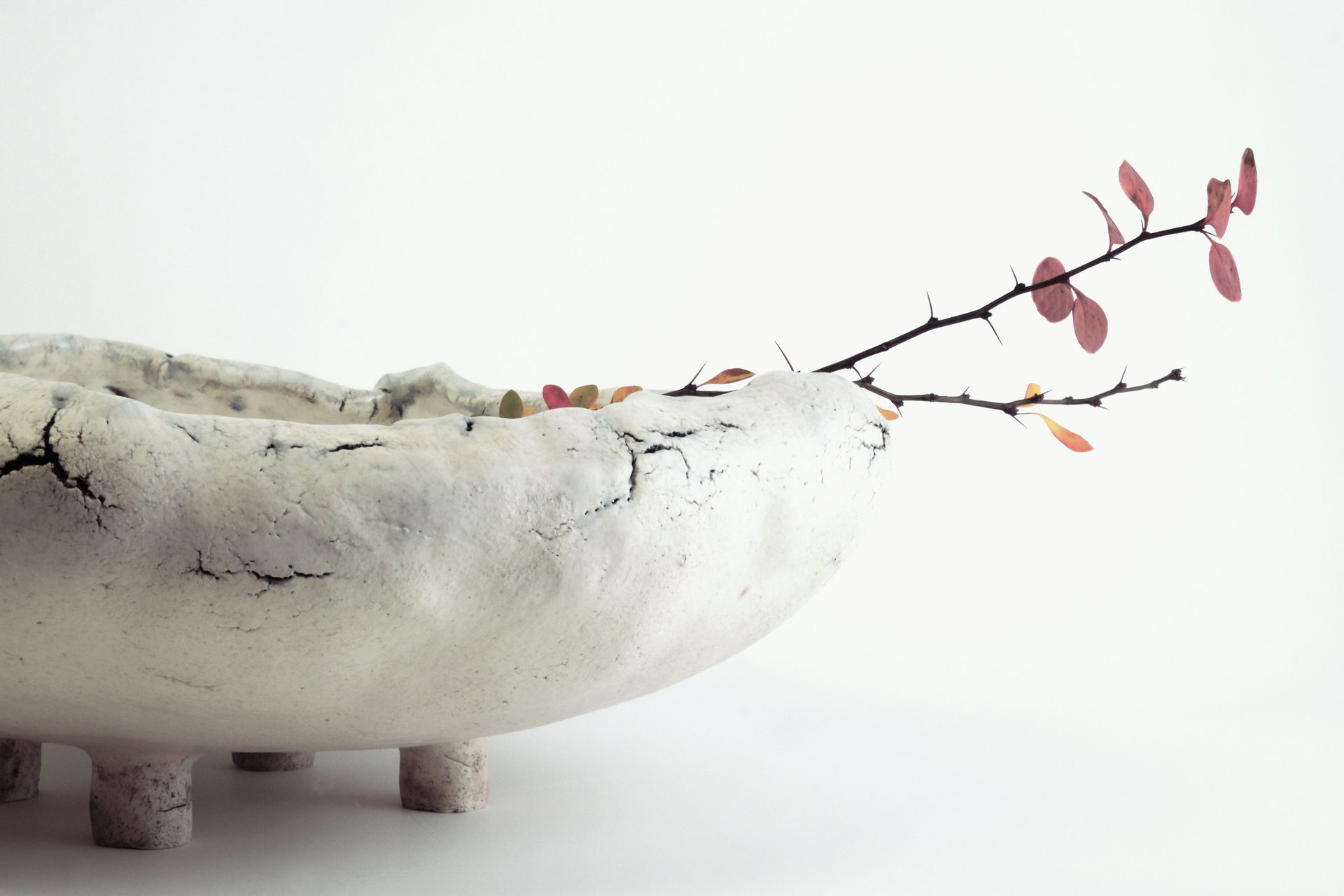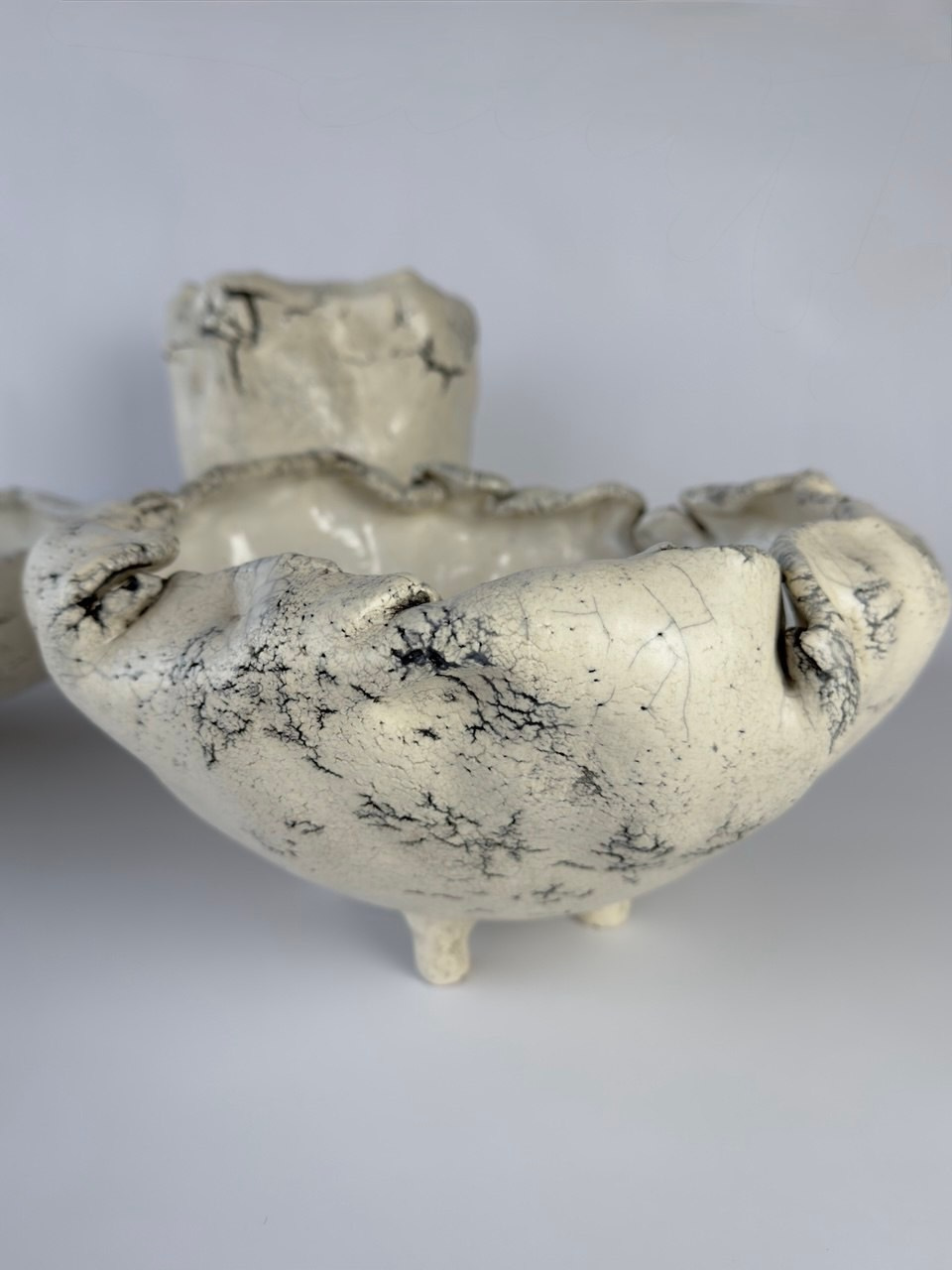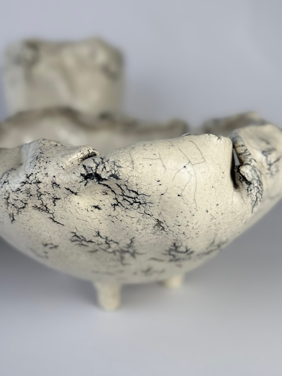 Серия «Еще, но не уже» исследует этот момент на уровне материи. Сосуды напоминают тающий весенний снег: внешне хрупкие, нестабильные, покрытые трещинами, они несут в себе следы холода. Трещины здесь — не дефекты, а свидетельство пройденного напряжения, визуальные проявления внутренней трансформации. Они трескаются, оплывают, теряют прежнюю жесткость, но именно в этом процессе обретают новую выразительность.
